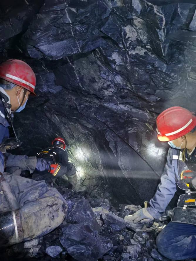 图丨赤峰大井子矿业二采区技术室地测组成员现场勘查揭露矿体具体状态数据图丨赤峰大井子矿业二采区技术室地测组成员进行矿体描述讨论论证