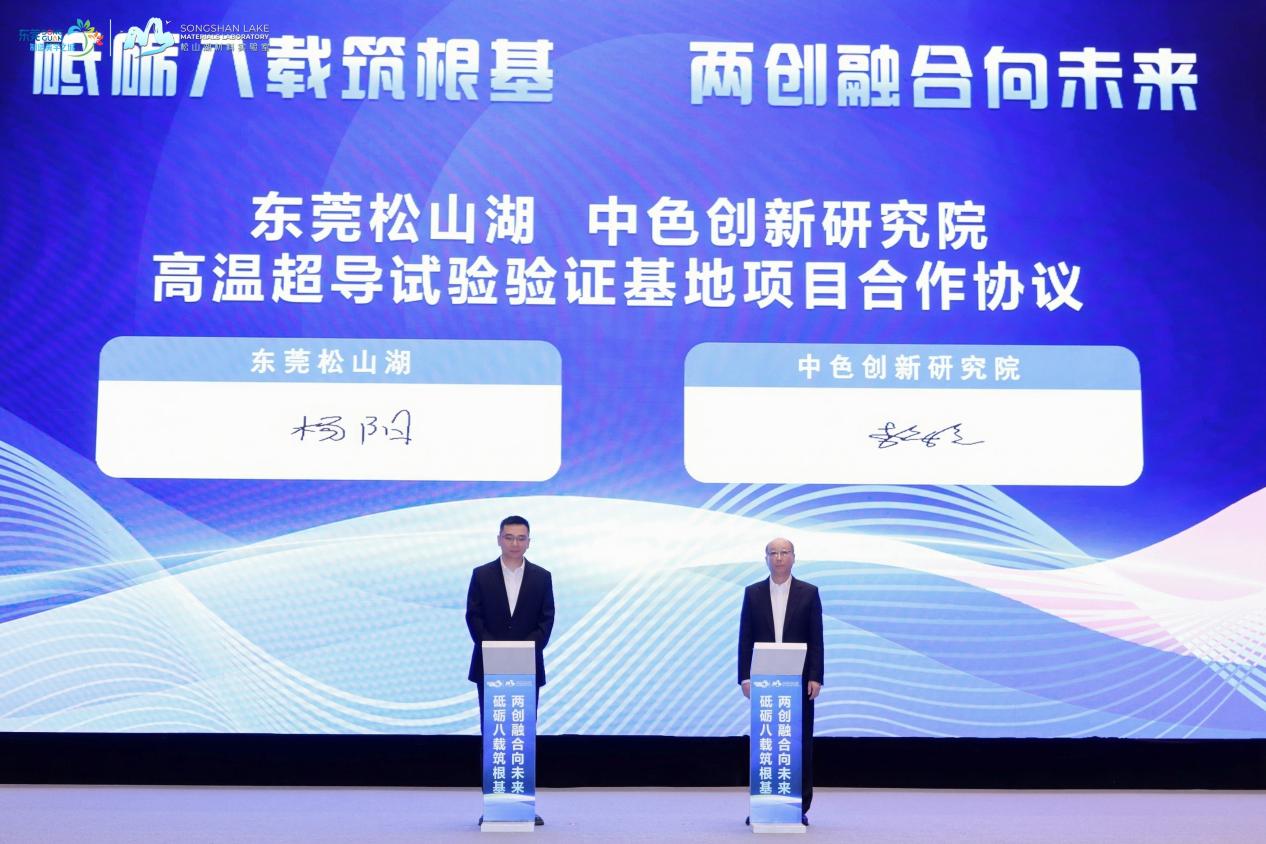 大会上,文岗和东莞市委书记韦皓共同为中色创新研究院东莞松山湖分院揭牌。会上还签订了《东莞市人民政府中国有色矿业集团有限公司战略合作协议》和《东莞松山湖中色创新研究院高温超导试验验证基地项目合作协议》。